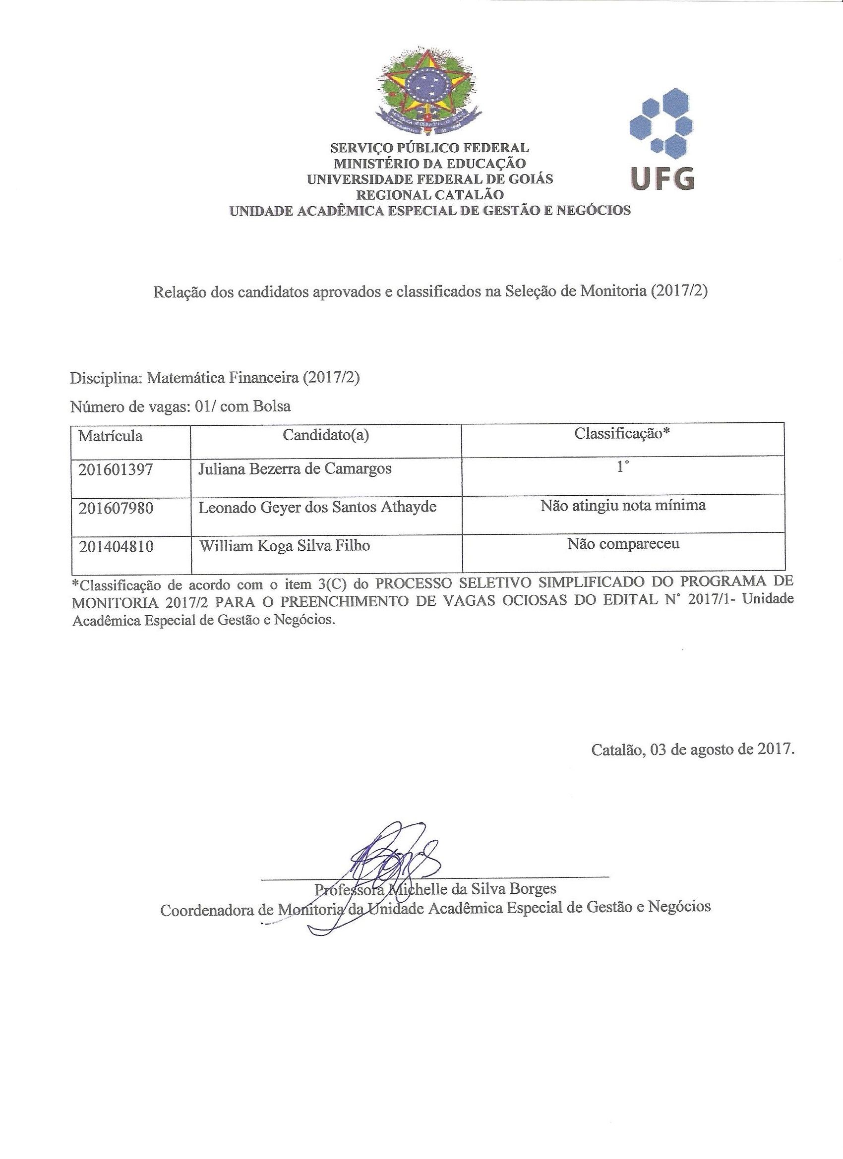 A Chefia da Unidade Acadêmica Especial de Gestão e Negócios torna publica o resultado final do programa de monitoria 2017/2 para preenchimento de vagas ociosas do Edital 2017/1.